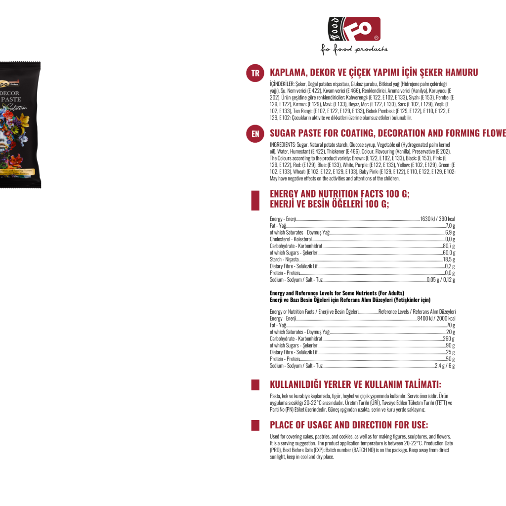 Использование: Количество наносимого теста отрезается, замешивается и формируется после того, как его эластичность достигается с помощью ручного нагрева. Наносимые торты, модели и фигурки не следует хранить во влажной среде, чтобы они не потеряли свою форму. После каждого применения рот пакета теста должен быть закрыт и предотвратить его высыхание. Если торты с покрытием хранятся в шкафах без веера при температуре +6 °C, срок хранения будет больше.