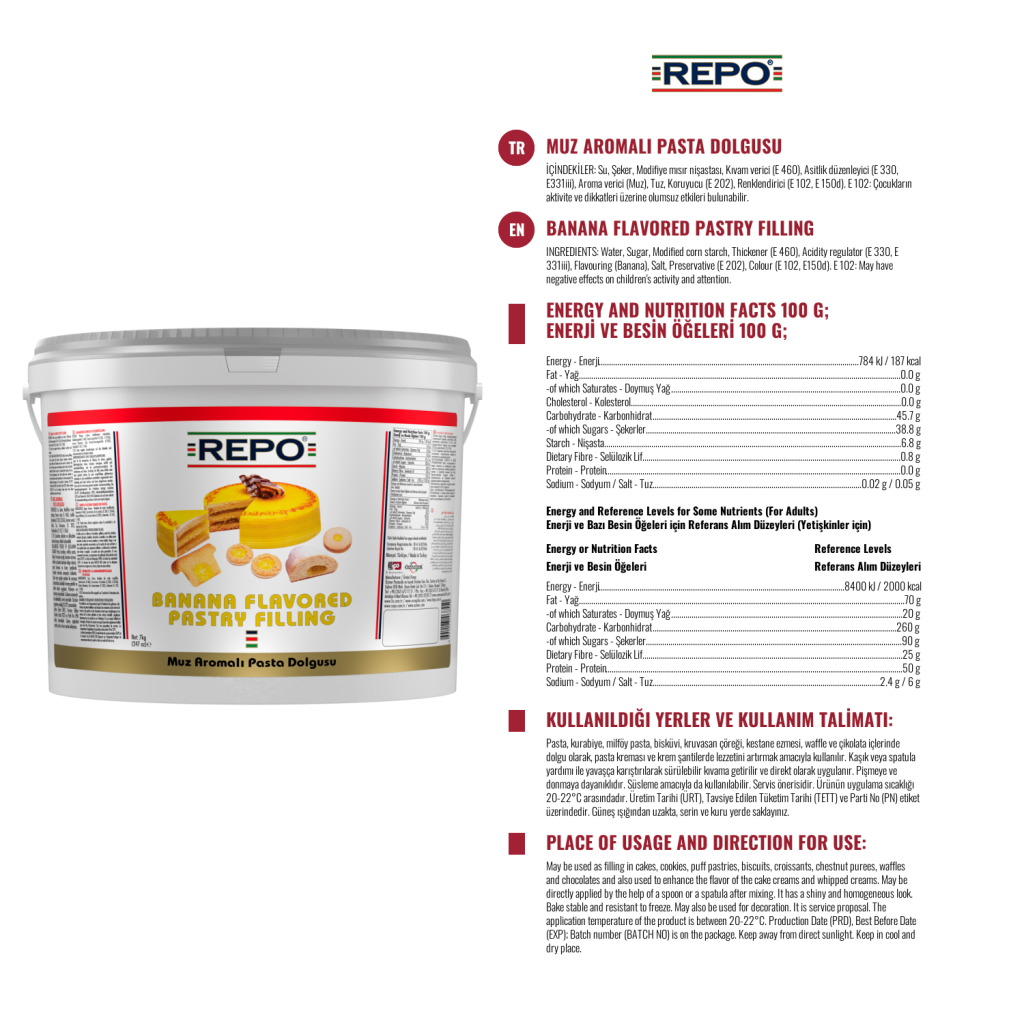 Тип упаковки: 7 кг, полипропиленовое ведро, коробка из 4 единиц Срок Службы: 2 года Области использования: Он используется в качестве начинки во всех тортах. Его можно смешивать с кондитерским кремом или взбитыми сливками, чтобы улучшить вкус. Его можно использовать в качестве начинки для печенья, тортов, слоеного теста, булочек из рогов, каштановой пасты и шоколада. Его также можно наносить в виде крема на вафли. Его также можно использовать в декоративных целях. Использование: Его смешивают в отдельном контейнере или в отдельном контейнере с помощью ложки или шпателя, довели до рассадимой консистенции и наносили непосредственно. Особенности продукта: Он не сохнет, не трескается и не не теряет блеск. Выглядит блестящим. Легко достичь пригодной для использования консистенции, и его однородность не ухудшается. Начинка сохраняет свои свойства в продуктах, подвергающихся воздействию высоких температур, таких как торты и печенье. В тесте нет утечек или впитывания. Его следует хранить в прохладном, сухом месте.