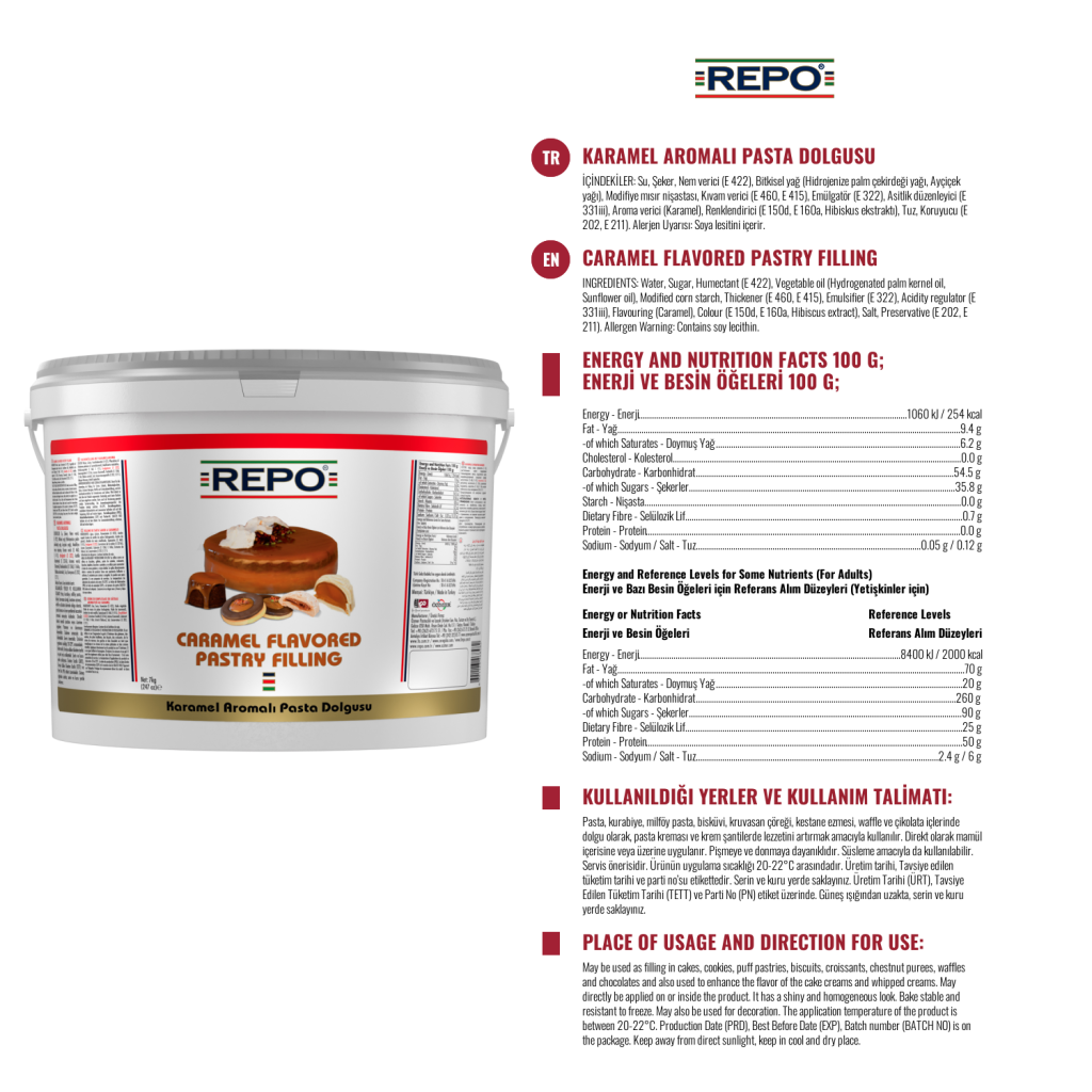 Тип упаковки: 7 кг, полипропиленовое ведро, 4 упаковки в коробке Срок годности: 2 года Области использования: Он используется в качестве начинки во всех видах тортов. Его можно смешать с кремом для торта или взбитыми сливками для усиления вкуса. Его можно использовать в качестве начинки для печенья, печенья, теста для милфи, круассанов, каштановой пасты и шоколада. Его также можно использовать в качестве вафельного крема. Его также можно использовать в декоративных целях. Как использовать: Смешайте его в отдельном контейнере или в отдельной миске с помощью плоской ложки или обычной ложки и нанесите его непосредственно, когда он будет в консистенции. Спецификация продукта: Он не сохнет, не трескается и не выцветает. У него блестящая внешность. Легко достичь пригодной для использования консистенции и не портит его однородность. Наполнитель сохраняет свои свойства в продуктах, подвергшихся воздействию высоких температур, таких как печенье и печенье. В тесте не происходит утечки или поглощения. Его следует хранить в прохладном, сухом месте
