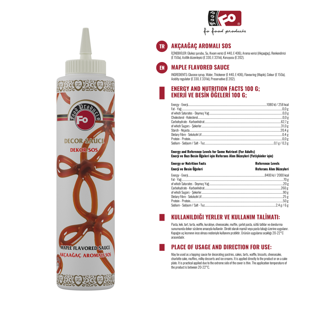 Kullanım Alanları : Dondurmalarda, kuplarda, pastalarda, meyveli yoğurtlarda, kahvaltı gevreklerinde, jölelerde, keklerde ve banket süslemelerde arzu edilen her yerde sos olarak istenilen miktarda kullanılır.