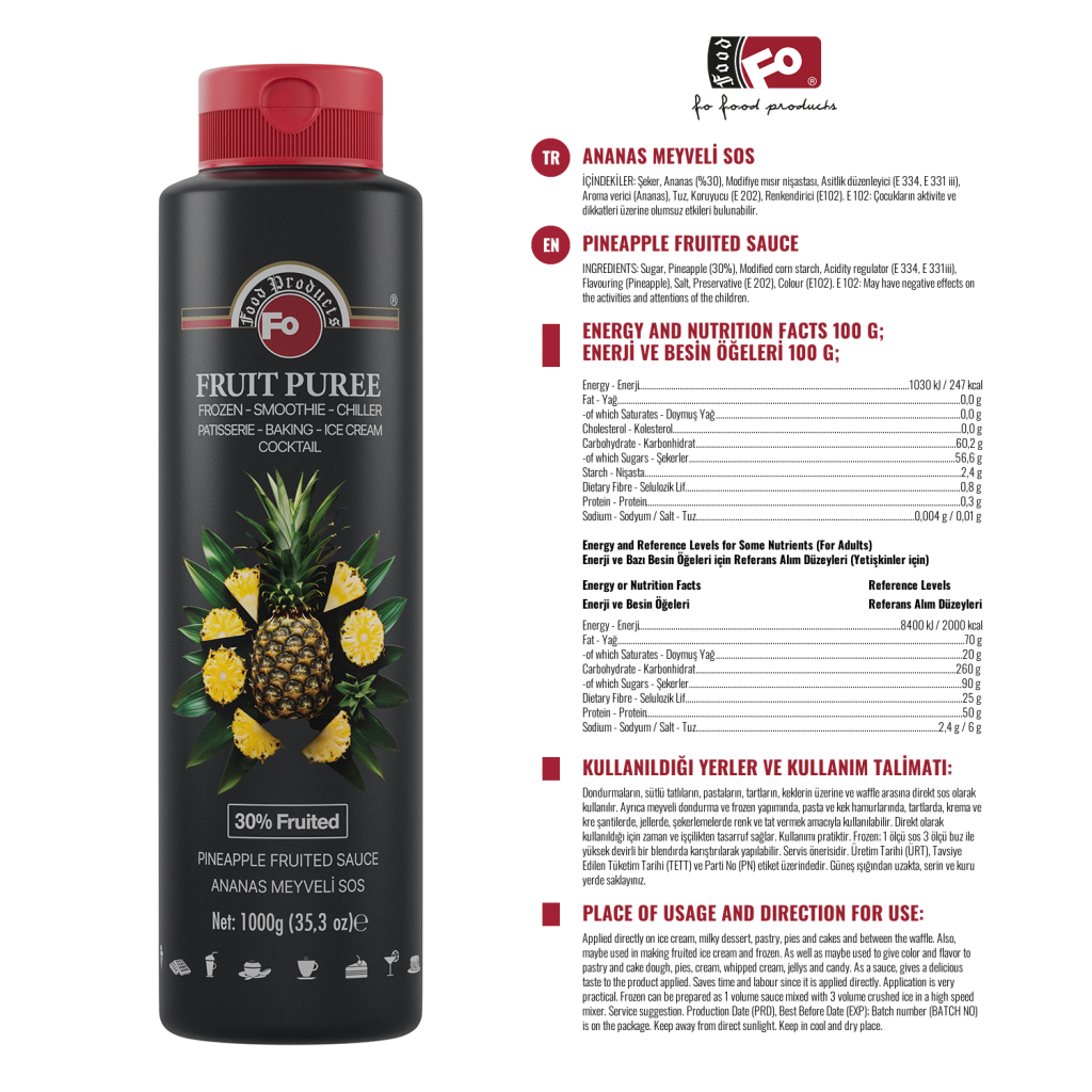 Ürün Özellikleri : Direkt olarak kullanıldığı için zaman ve işçilikten tasarruf sağlar. Kullanımı pratiktir. Yoğun meyve oranı ile elde edilen sosumuz farklı lezzetler elde etmek için idealdir. Rengi parlak ve canlıdır. Kullanıldığı ürünün albenisini artırır.