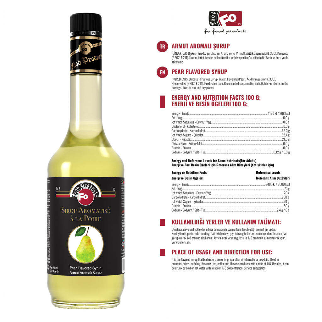 Ürün Özellikleri: Yapay tatlandırıcı içermez. Albenili ve sağlıklı ambalajı ile vitrinlerinize estetik bir görünüm kazandırır. Aroma, renk ve yoğunluk bakımından tercih nedenidir. Diğer şuruplara göre kuru madde oranı % 10 fazla olmasına rağmen, %30 daha az tatlıdır. Ağzı açıldıktan sonra kapak kapalı olarak muhafaza edilirse; son tüketim tarihine kadar aroma, renk ve yoğunluğunda herhangi bir azalma olmaz.
