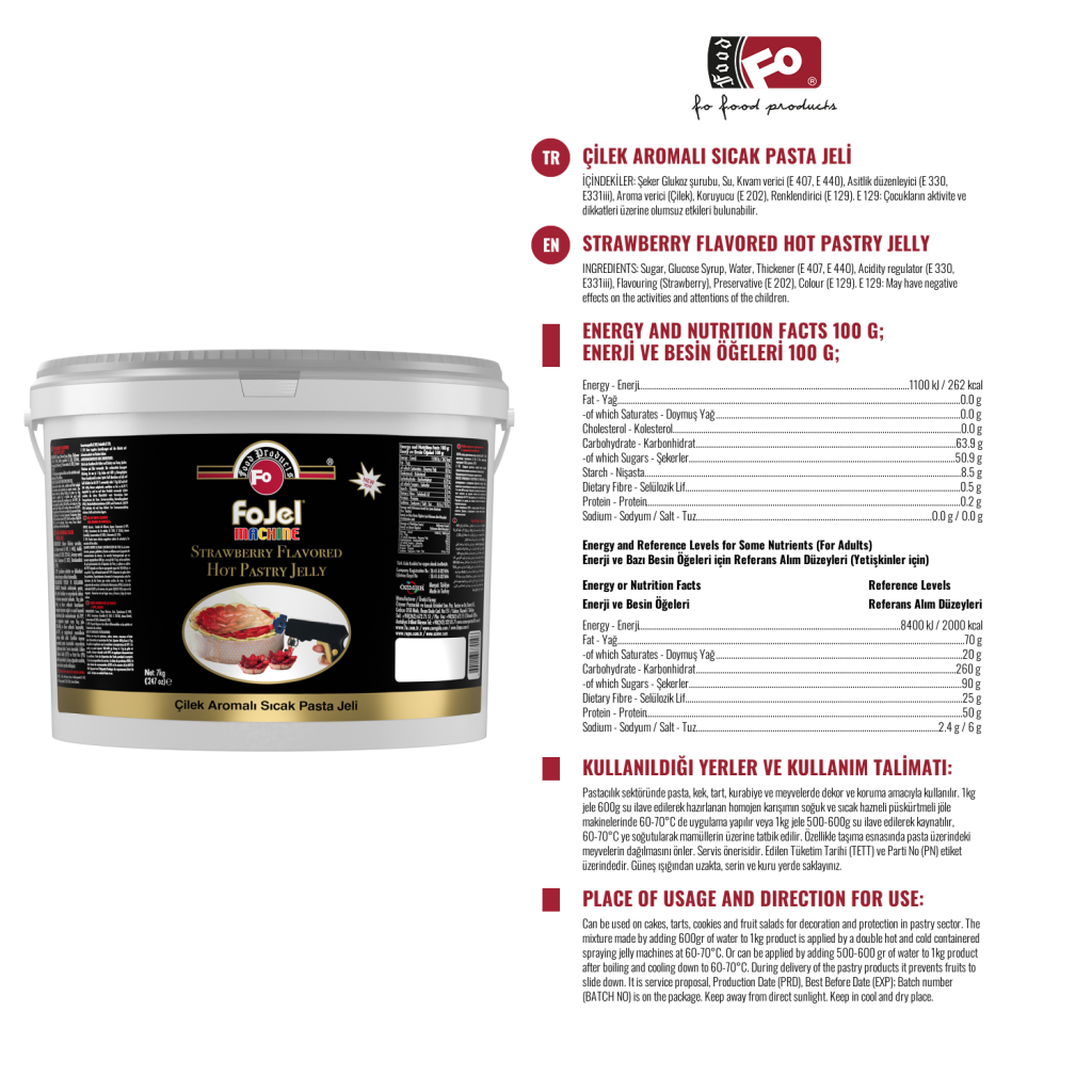 Kullanım Şekli: 1 kg jele  500 - 600 gr su ilave edilerek 90-95 °C ye kadar 1-2 dakika kaynatılır. 60 - 70 °C dereceye kadar soğutulduktan sonra kullanılacak olan ürün  üzerine püskürtülerek veya fırça yardımı ile tatbik edilir.