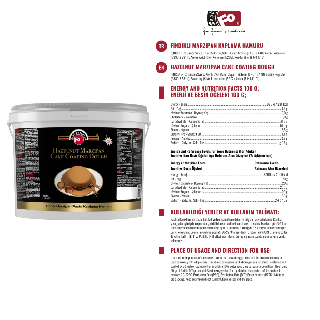 Ürün Özellikleri : Gıda boyası içermez. Naturel bir ürün olup içeriğinde %35-%40 oranında çikolata bulunmaktadır. Direkt yenilebilir bir özelliğe ve elastiki bir yapıya sahiptir. Kolay yoğurulur, ele yapışmaz. Pasta üzerinde kullanıldığında keserken çatlama yapmaz. Dünyada ilk olma özelliğindedir. Pastalara verdiği büyülü lezzet ve şık görüntüsü ile vazgeçilmez bir üründür.