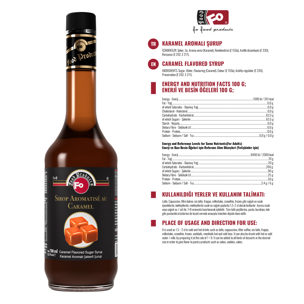 Kullanım Alanları : Latte, Capuccino, fitre kahve, ice latte, frappe, milkshake, smoothie, frozen gibi soğuk ve sıcak içeceklerde, kokteyllerde,sıcak ve soğuk çaylarda 1,5-2 cl olarak kullanılır. Ayrıca sıcak veya soğuk su / süt ile, 1+8 oranında hazırlanarak içilebilir. Tüm tatlı çeşitlerine, pasta, kurabiye, kek gibi pastacılık ürünlerine de lezzet vermek amacıyla istenilen ölçüde ilave edilir.