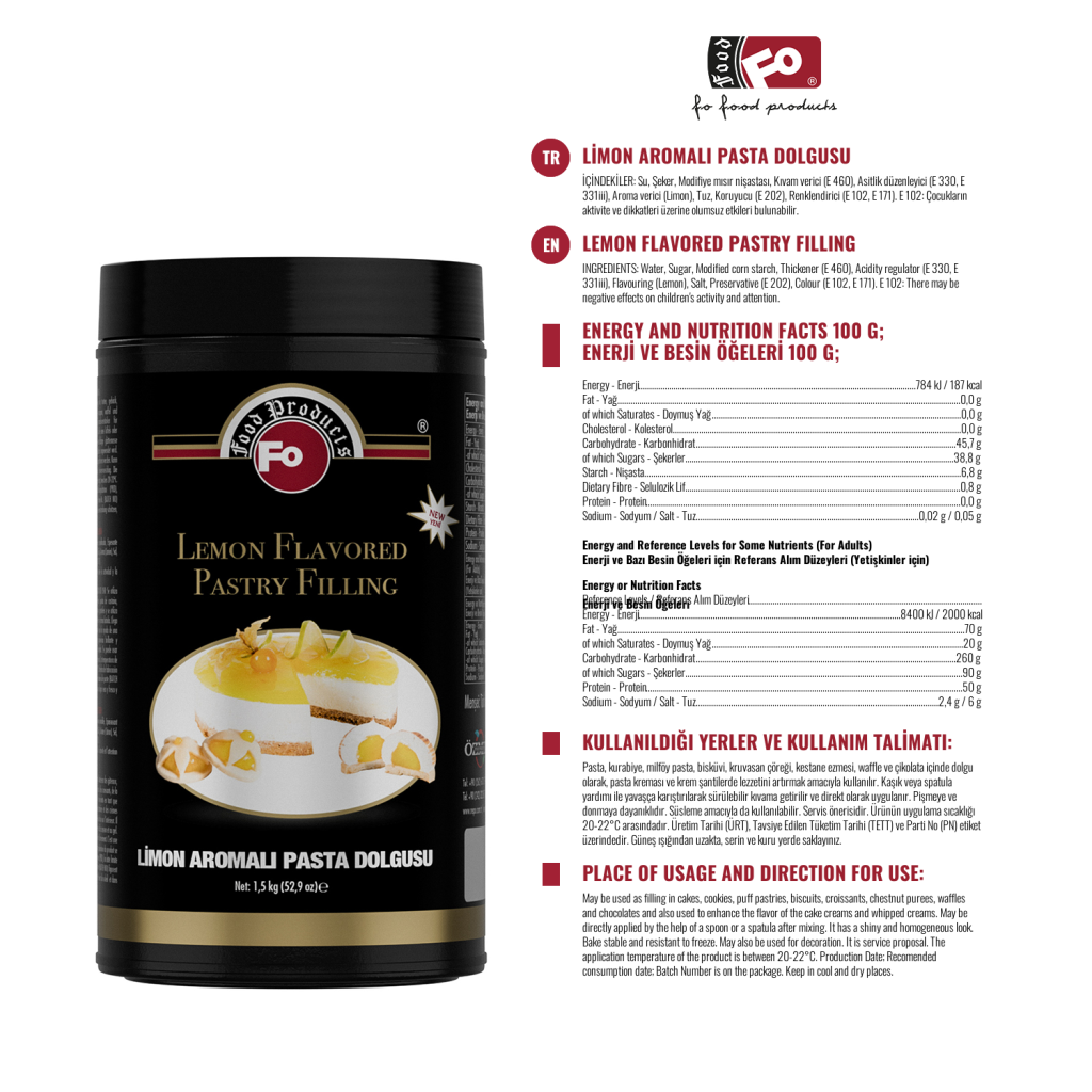 Ürün Özellikleri: Kuruma, çatlama ve matlaşma yapmaz. Parlak bir görünüme sahiptir. Kullanılabilir kıvama gelmesi kolaydır ve homojenliği bozulmaz. Bisküvi, kurabiye gibi yüksek sıcaklılara maruz kalan ürünlerde dolgu, özelliğini korumaktadır. Dışarıya sızma veya hamurun içinde emilme olmamaktadır. Serin ve kuru yerde muhafaza edilmelidir.