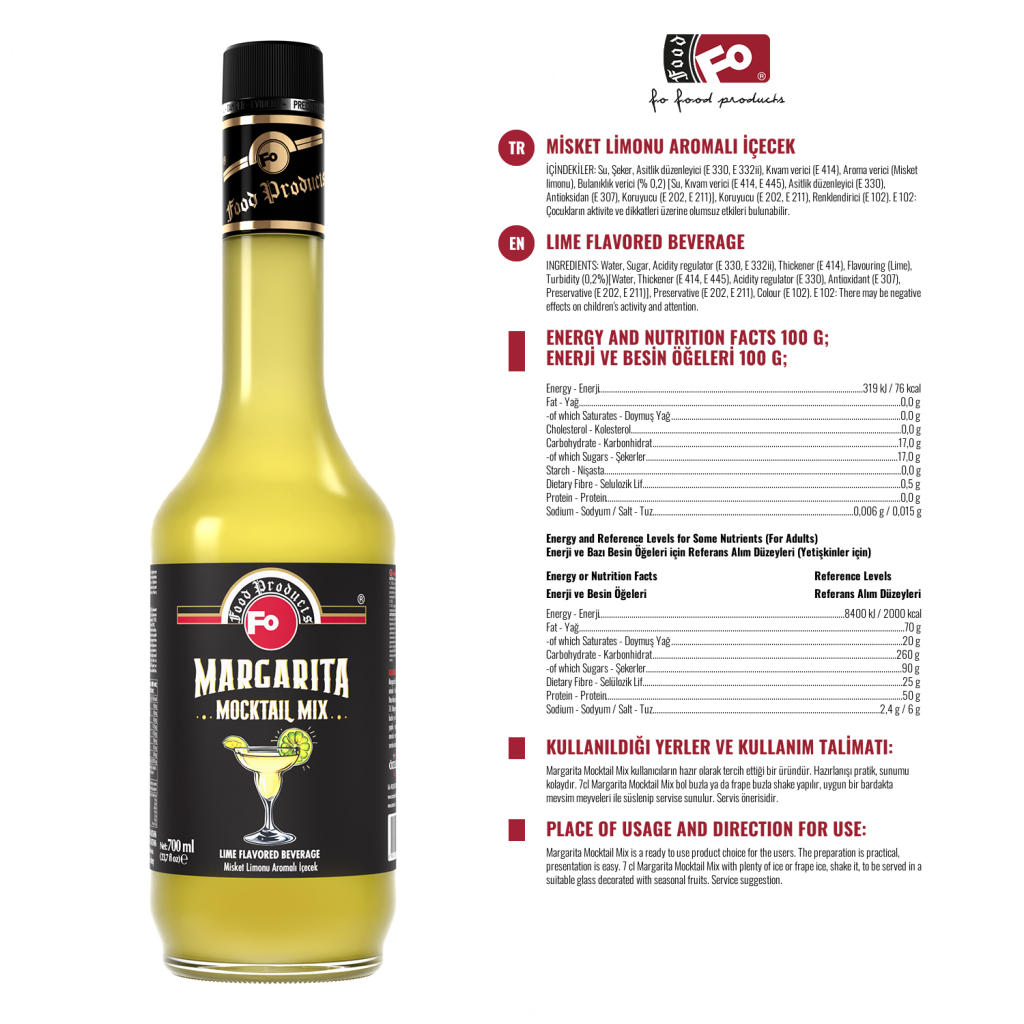Kullanım Şekli : 7 cl Margarita Kokteyl Mix, 4 cl tekila veya votka ile bol buzla shake yapılır. Kokteyl bardağında mevsim meyveleri ile süslenerek servise sunulur. Alkolsüz tercih edildiği takdirde ise 7 cl Margarita Kokteyl Mix bol buzla shake yapılır.
