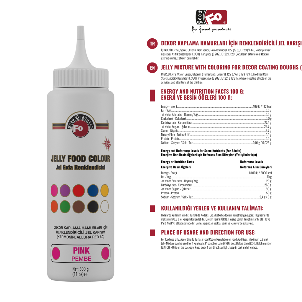 Ürün Özellikleri : 10 çeşit renkte ve Türkiye'de ilk olma özelliğindedir. Kullanıldığı ürüne çok kısa sürede rengini verir. Hamurun renklendirilmesi esnasında hamurun özelliklerini bozmamaktadır.