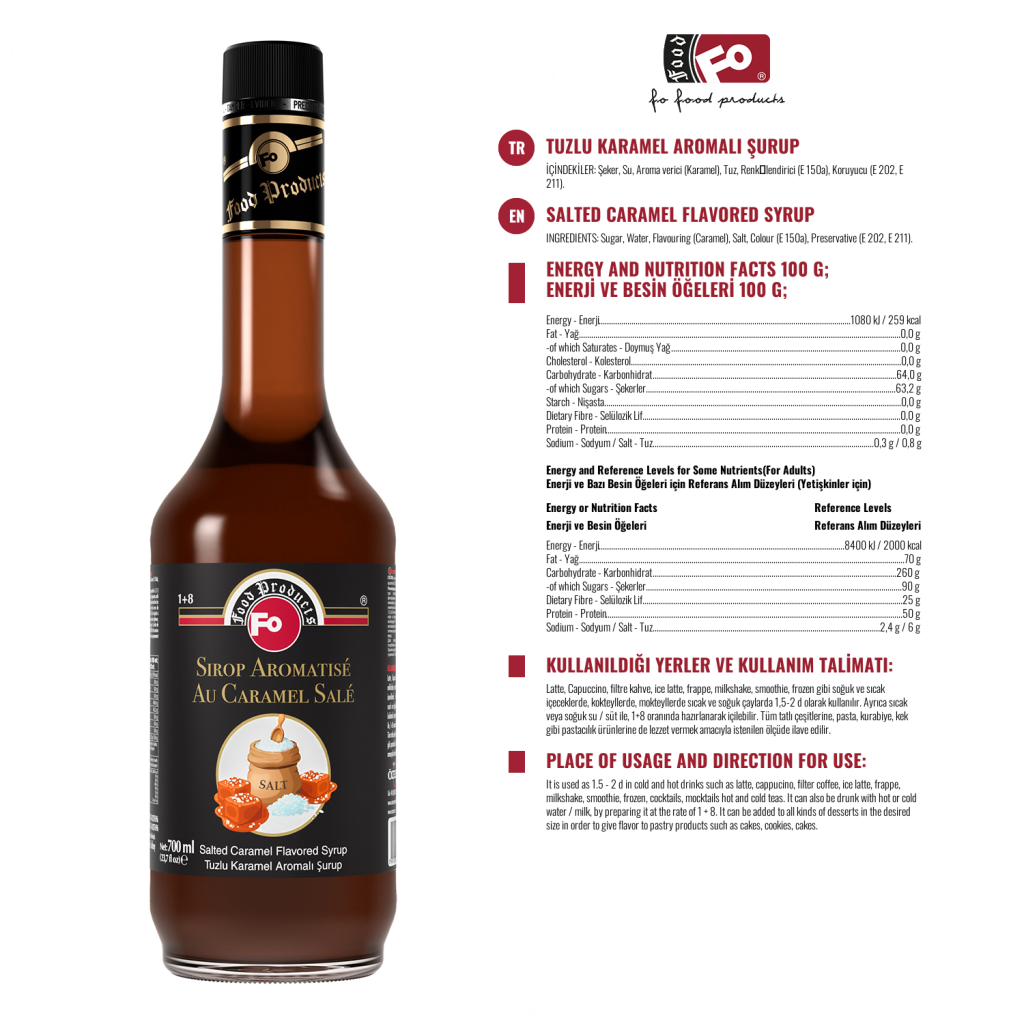 Kullanım Alanları: Alkollü ve alkolsüz kokteyllerde, kremalarda, krem, şantilerde, keklerde, pastalarda, yenilebilir buzlarda, ice slush’larda istenilen ölçüde pratik olarak kullanılır. Latte, Capuccino, fitre kahve, ice latte, frappe, milkshake, smoothie, frozen gibi soğuk ve sıcak içeceklerde, kokteyllerde,sıcak ve soğuk çaylarda 1,5-2 cl olarak kullanılır. Ayrıca sıcak veya soğuk su / süt ile, 1+8 oranında hazırlanarak içilebilir. Tüm tatlı çeşitlerine, pasta, kurabiye, kek gibi pastacılık ürünlerine de lezzet vermek amacıyla istenilen ölçüde ilave edilir.