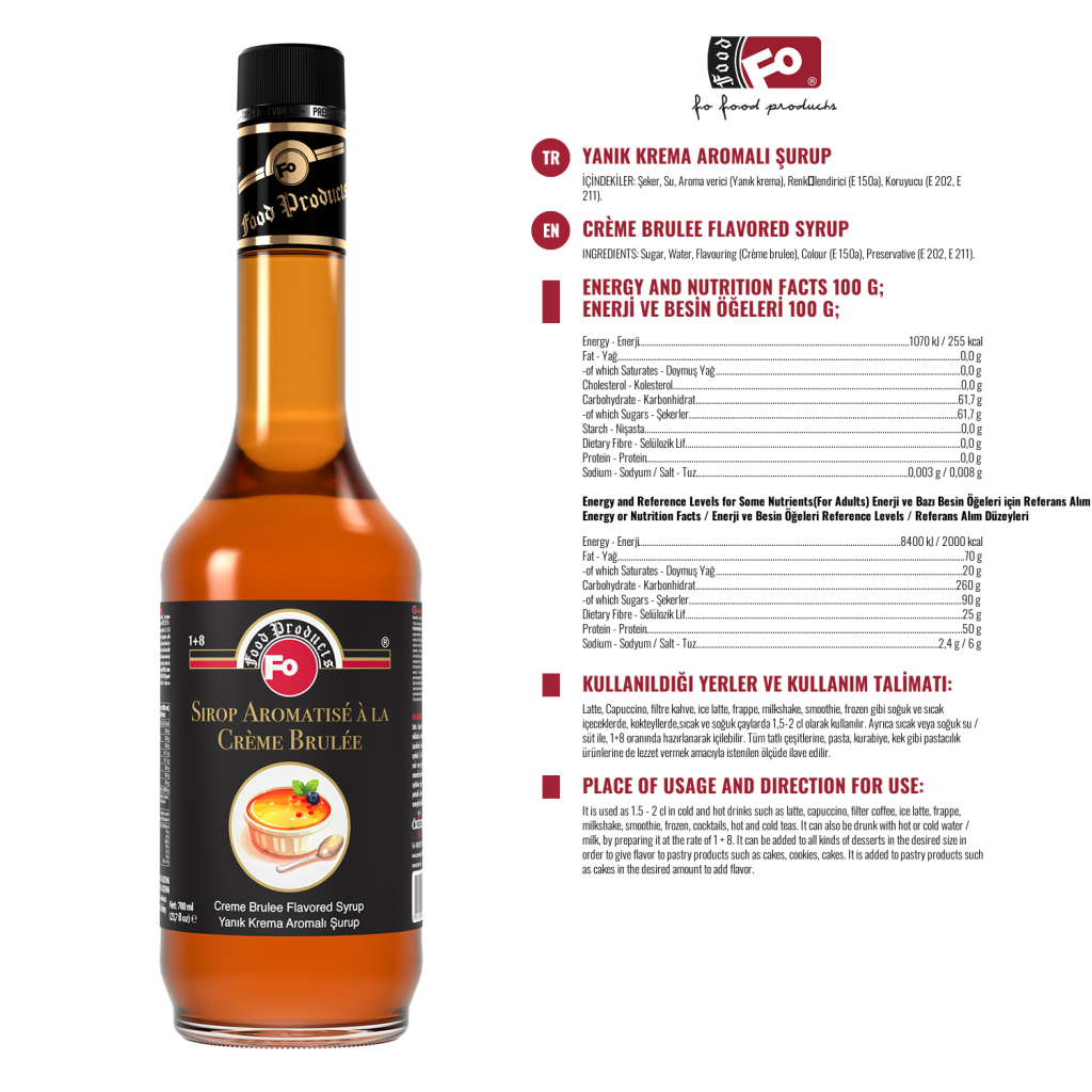 Kullanım Alanları: Alkollü ve alkolsüz kokteyllerde, kremalarda, krem, şantilerde, keklerde, pastalarda, yenilebilir buzlarda, ice slush’larda istenilen ölçüde pratik olarak kullanılır.
