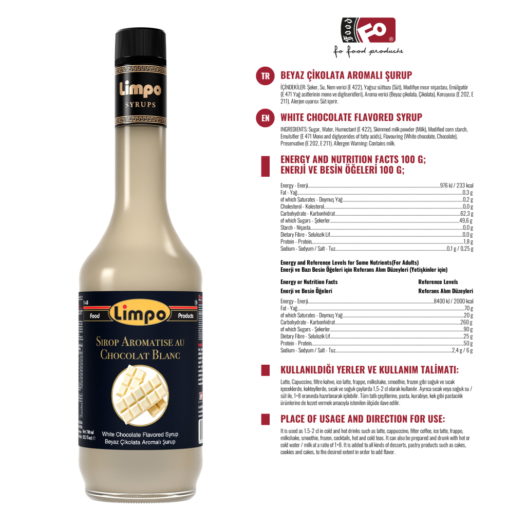 Ürün Özellikleri: Yapay tatlandırıcı içermez. Albenili ve sağlıklı ambalajı ile vitrinlerinize estetik bir görünüm kazandırır. Aroma, renk ve yoğunluk bakımından tercih nedenidir. Diğer şuruplara göre kuru madde oranı % 10 fazla olmasına rağmen, %30 daha az tatlıdır. Ağzı açıldıktan sonra kapak kapalı olarak muhafaza edilirse; son tüketim tarihine kadar aroma, renk ve yoğunluğunda herhangi bir azalma olmaz.