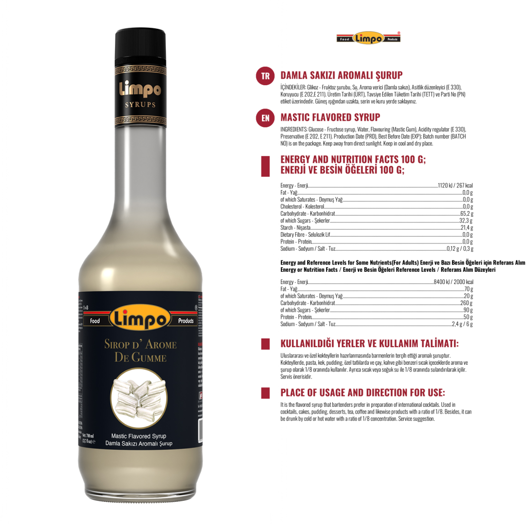 Ürün Özellikleri: Yapay tatlandırıcı içermez. Albenili ve sağlıklı ambalajı ile vitrinlerinize estetik bir görünüm kazandırır. Aroma, renk ve yoğunluk bakımından tercih nedenidir. Diğer şuruplara göre kuru madde oranı % 10 fazla olmasına rağmen, %30 daha az tatlıdır. Ağzı açıldıktan sonra kapak kapalı olarak muhafaza edilirse; son tüketim tarihine kadar aroma, renk ve yoğunluğunda herhangi bir azalma olmaz.