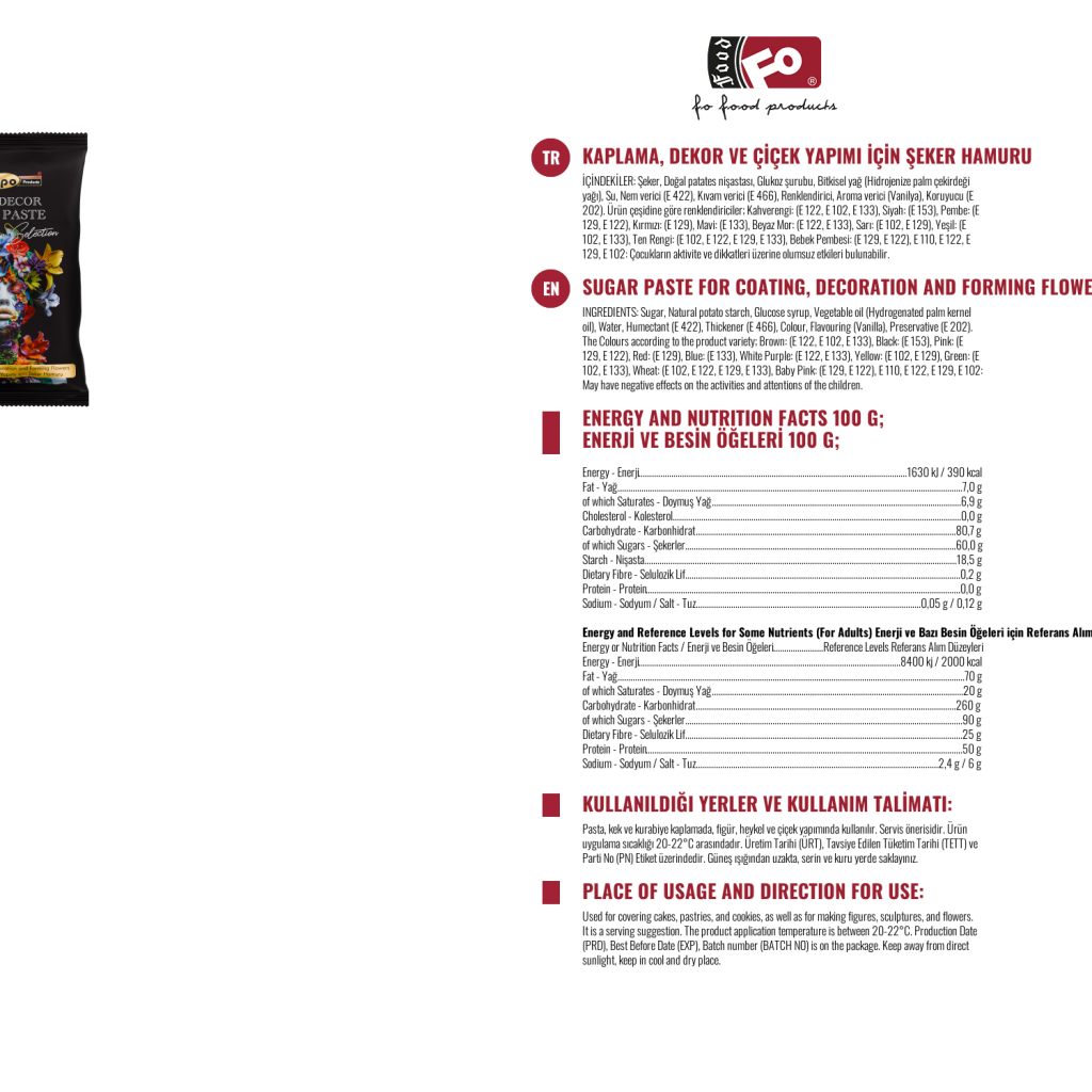 Kullanım Alanları : Her türlü pasta kaplamalarında, dekoratif ve maket kaplamaları ve süslemelerinde, Çikolata ve sade kek kaplamalarında kullanılır.