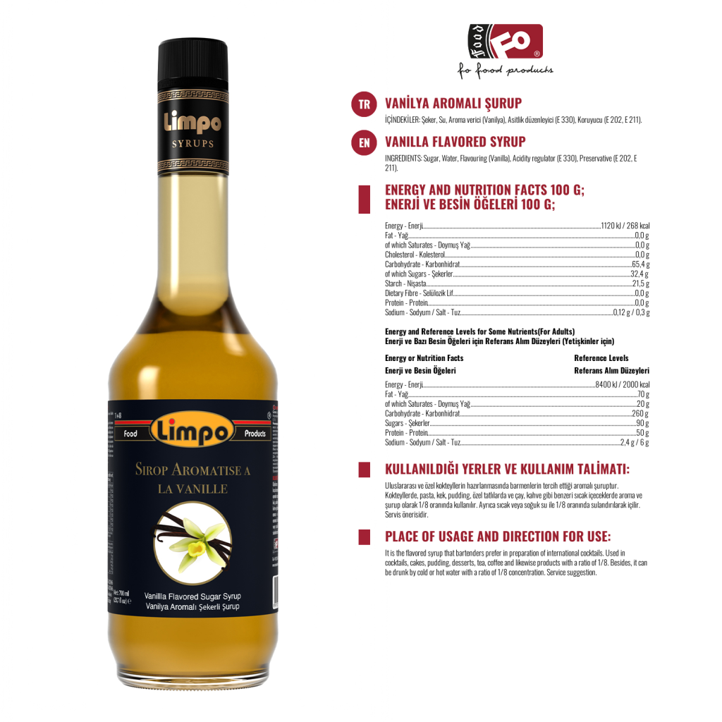 Ürün Özellikleri: Yapay tatlandırıcı içermez. Albenili ve sağlıklı ambalajı ile vitrinlerinize estetik bir görünüm kazandırır. Aroma, renk ve yoğunluk bakımından tercih nedenidir. Diğer şuruplara göre kuru madde oranı % 10 fazla olmasına rağmen, %30 daha az tatlıdır. Ağzı açıldıktan sonra kapak kapalı olarak muhafaza edilirse; son tüketim tarihine kadar aroma, renk ve yoğunluğunda herhangi bir azalma olmaz.