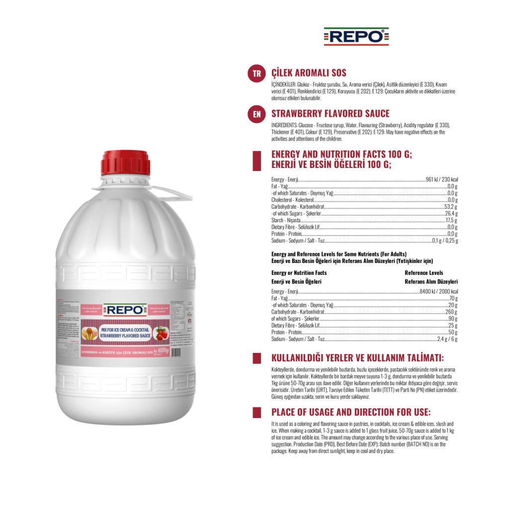 Ürün Özellikleri : Yapay tatlandırıcı içermez. 1 e 30 oranında sulandırılacak ölçüde konsantre olduğundan ekonomik ve pratiktir. Limon konsantresi kullanılarak üretilmiştir. Alışılmış olan limon tadını tüm doğallığı ile damaklarınızda hissedebilirsiniz. Kokteyllerde 1-3 dispenser basımı (1-3 gr) diğer ürünlerde 1 kg ürüne 50-70 gr arası kokteyl sosu kullanılır. Aroma, renk ve yoğunluk bakımından tercih nedenidir.