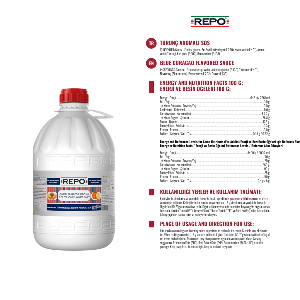 Ürün Özellikleri : Yapay tatlandırıcı içermez. 1 e 30 oranında sulandırılacak ölçüde  konsantre olduğundan ekonomik ve pratiktir. Limon konsantresi kullanılarak üretilmiştir. Alışılmış olan limon tadını tüm doğallığı ile damaklarınızda hissedebilirsiniz. Kokteyllerde 1-3 dispenser basımı (1-3 gr) diğer ürünlerde 1 kg ürüne 50-70 gr arası kokteyl sosu kullanılır. Aroma, renk ve yoğunluk bakımından tercih nedenidir.